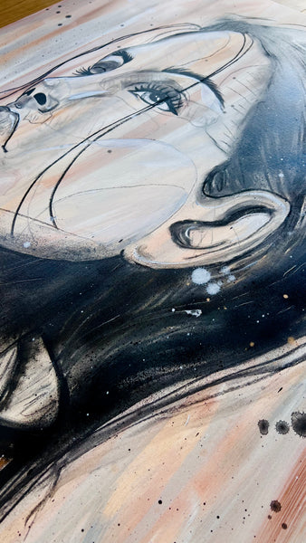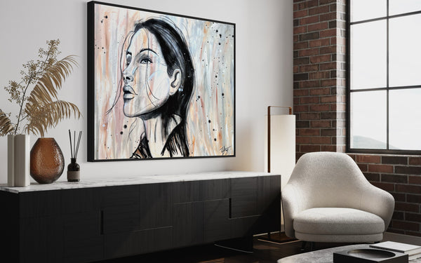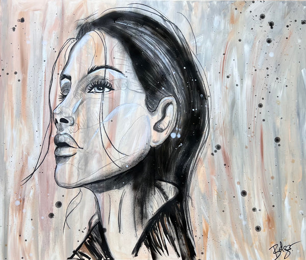 Dieses 120x100 cm große Kunstwerk auf Leinwand kombiniert kraftvolle Kohlezeichnungen mit lebendiger Acrylfarbe. Das skizzenhafte Porträt erwacht auf einem warmen beige-braunen Hintergrund zum Leben und bringt Gedanken auf eine ausdrucksstarke, fast schon verspielte Weise zum Ausdruck. Perfekt, um jedem Raum eine kreative und lebhafte Atmosphäre zu verleihen!