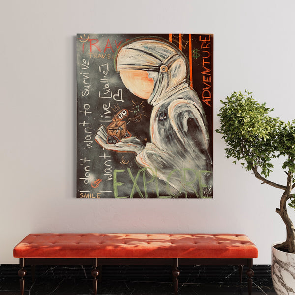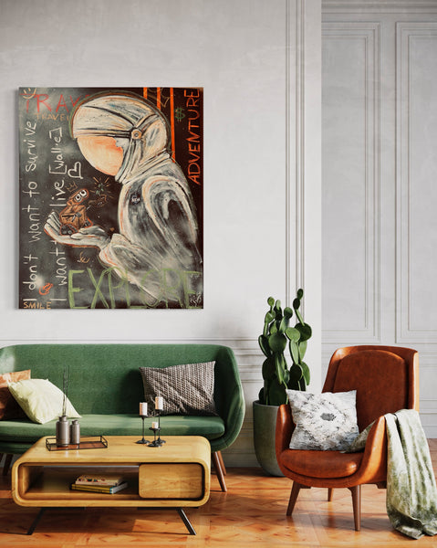 Dieses Leinwandbild im Format 70x100 cm bringt mit Acrylfarbe und Acrylkreide lebendige Farben auf einen dunklen Hintergrund. Die farbenfrohen Figuren – ein Astronaut und ein kleiner Wall-e – setzen einen starken Kontrast und ziehen die Blicke auf sich. Die eingängige Quote „I don't want to survive, I want to live“ verleiht dem Bild eine tiefe, zugleich spielerische Botschaft, die zum Träumen und Leben einlädt. Perfekt, um jedem Raum Energie und Persönlichkeit zu schenken!
